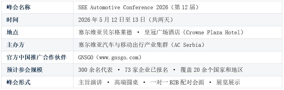 第12届SEE汽车峰会(SEE Automotive Conference 2026)将于5月12日至13日在塞尔维亚首都贝尔格莱德皇冠广场酒店隆重举行。本届峰会由塞尔维亚汽车与移动出行产业集群(AC Serbia)主办,GNSGO作为唯一官方中国推广合作伙伴,正式面向国内汽车零部件、工业自动化及新能源领域企业发布招募公告。