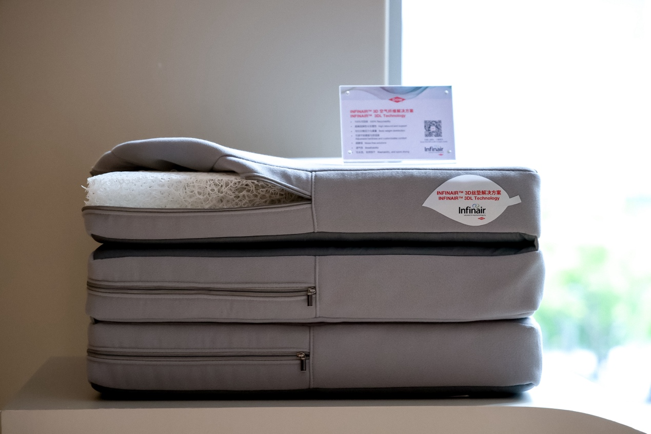 陶氏公司已经与李尔(Lear)公司合作,将INFINAIR™ 3D Loop 空气纤维解决方案应用于李尔公司的FlexAir产品,实现了汽车座垫轻量化、可回收、零泡沫、全透气的解决方案,满足了舒适度、性能与可持续性的市场需求。根据李尔公司说明,FlexAir产品支持座垫整体回收,并有望减少高达50%的二氧化碳排放,实现约20%的车辆减重,为座椅材料从原料至再生构建完整循环生命周期。