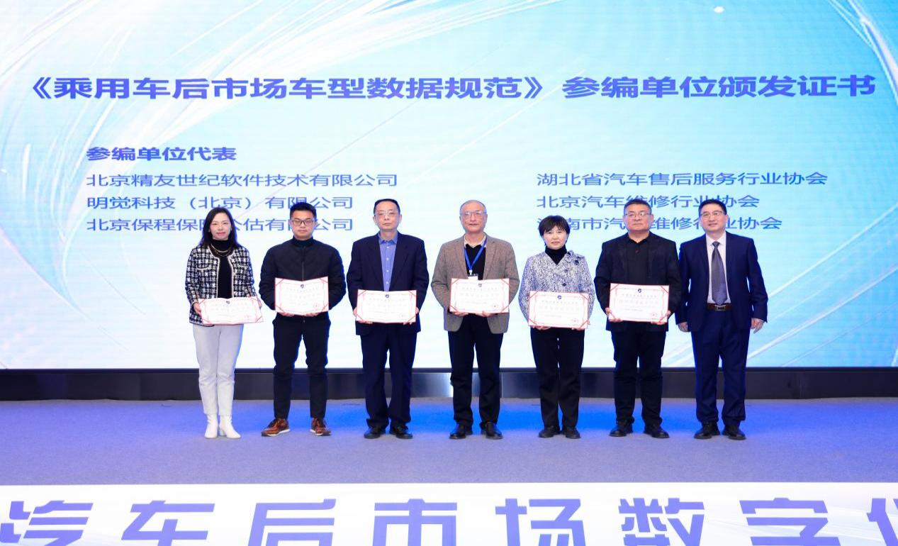 大会期间,举行了团体标准《乘用车后市场车型数据规范》发布仪式,底彦彬为部分参编单位颁发证书。北京精友世纪软件技术有限公司副总经理曹学军代表编写组进行标准解读。