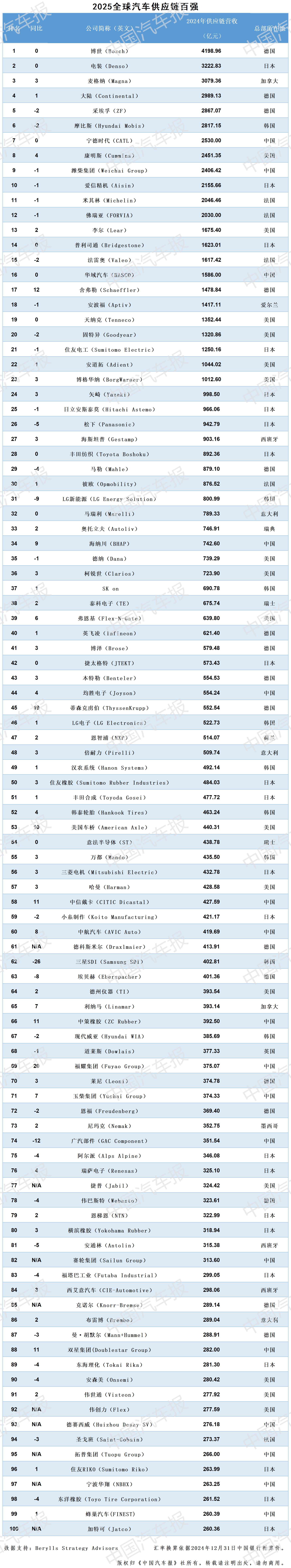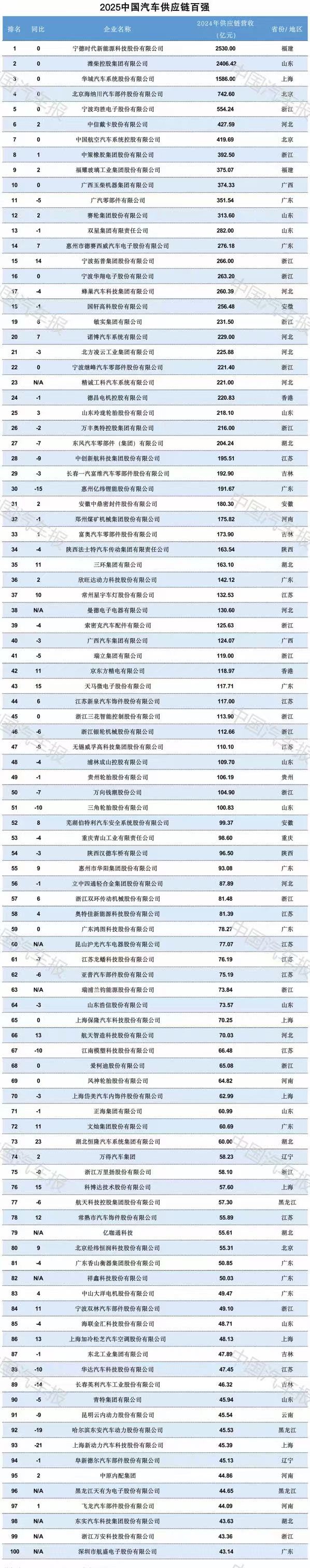 全球汽车供应链百强、中国汽车供应链百强: