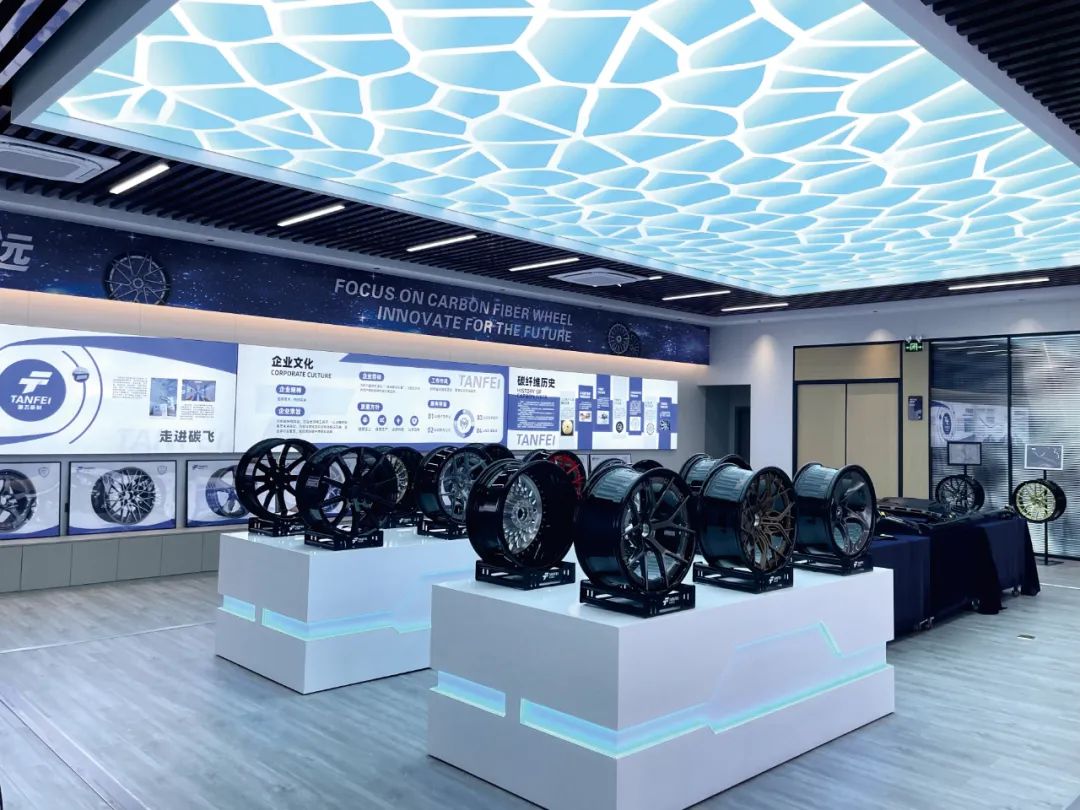 宁波碳飞新材的展厅里,一款21英寸碳纤维轮毂仅重10 kg,比铝合金轮毂轻40%。众所周知,减重1 kg等于增加2 km续驶。一般企业的标准采用国标GB/T 5334-2022(乘用车车轮性能要求和试验方法)循环次数是50万次,而碳飞的碳纤维轮毂已达200万次。宁波碳飞新材料有限公司专注于碳纤维复合材料的研发、制造和产业化应用。公司前身自2018年起已在该领域进行研发,并于2024年建成国内首条年产万支碳纤维汽车车轮生产线,取得了突破性的成果。